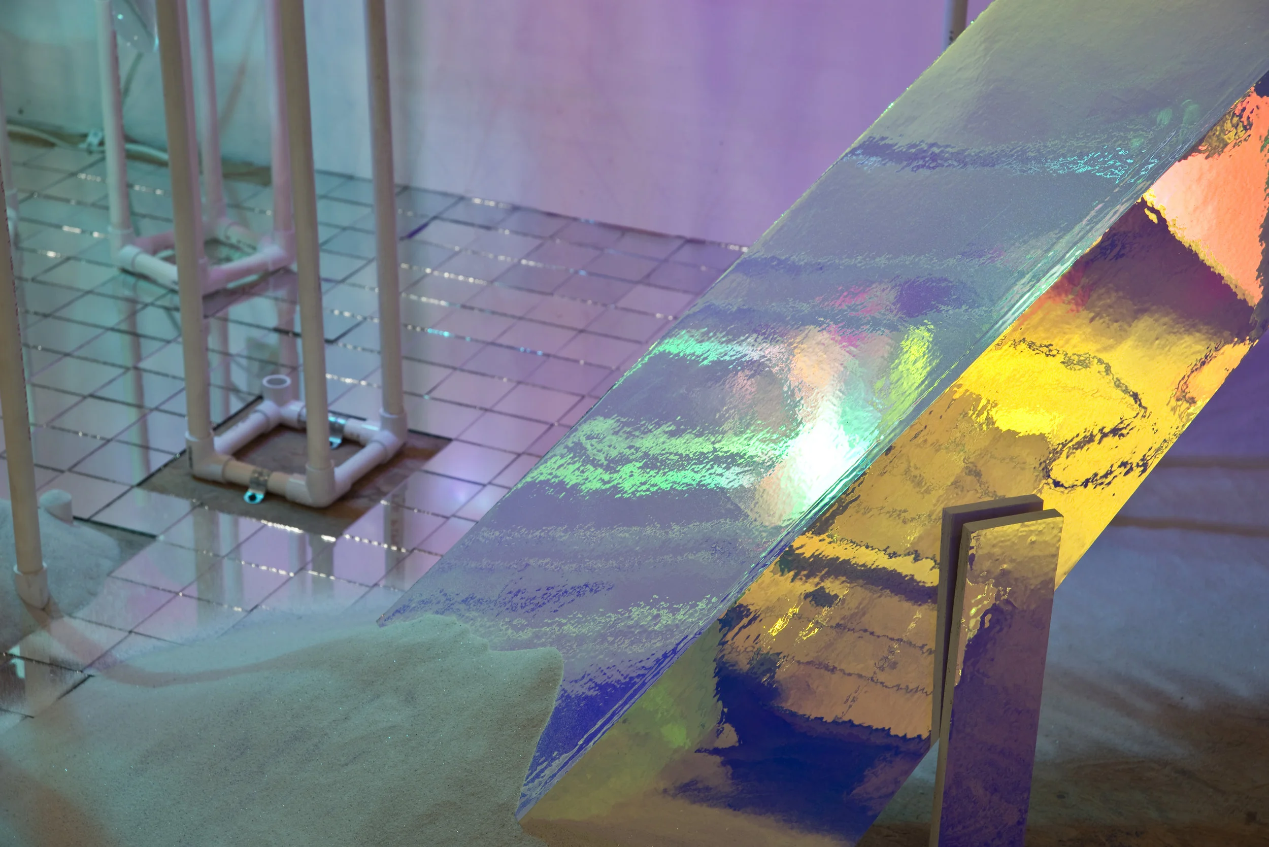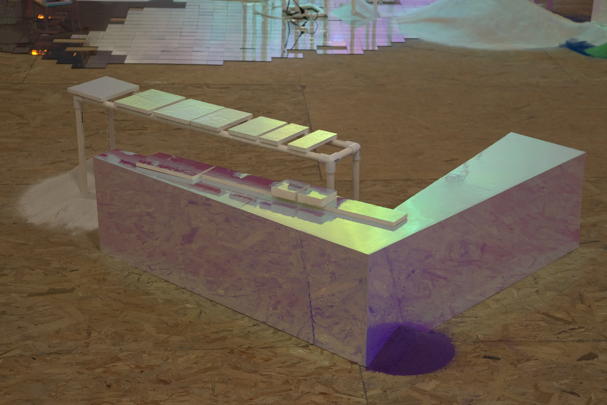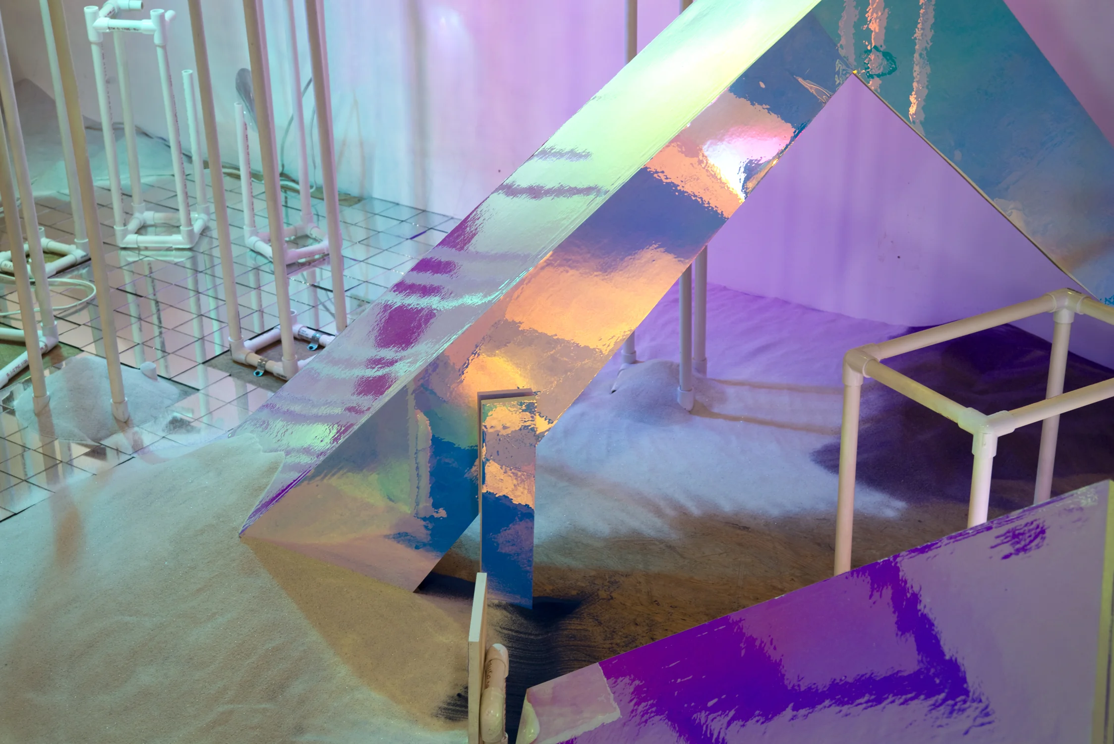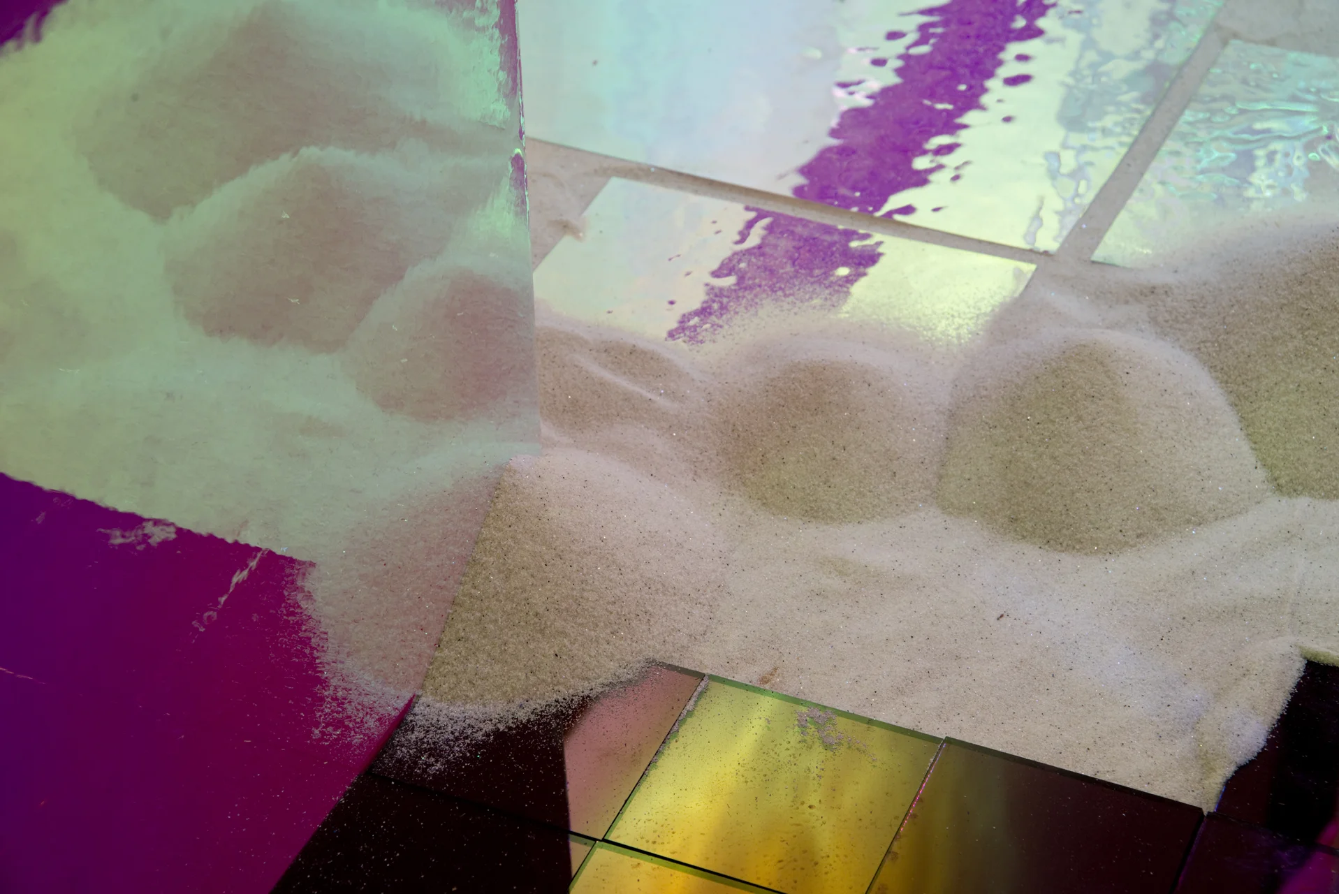 Installation made with dichroic film, PVC pipes, clamp lights, colored sand, mirrors, wood, fresnel lenses. 2017.