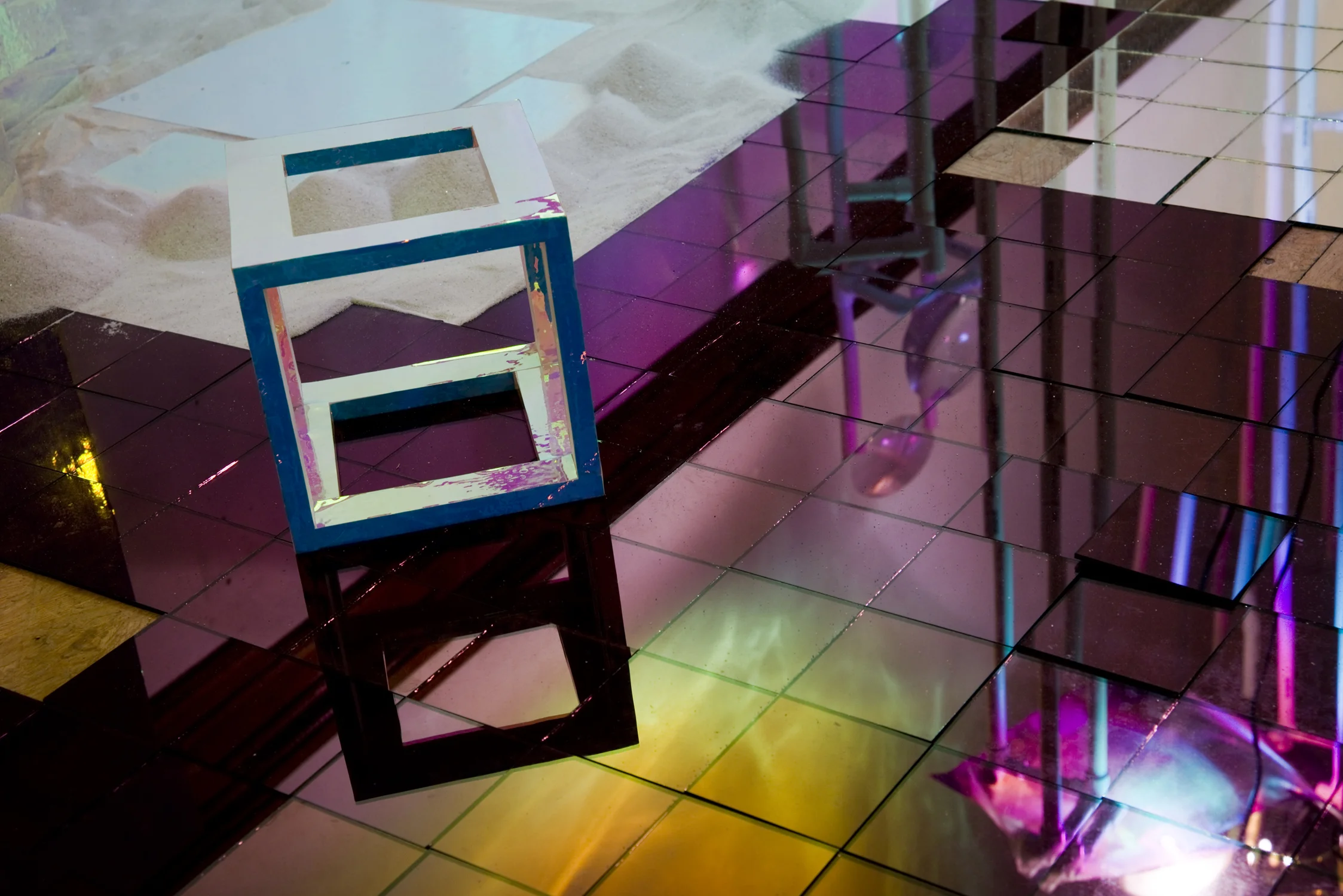 Created using light-responsive, perception-altering materials, this work explores the relationship between observation and reality, and what lies beyond our "observed reality." The pyramidal forms seem to disappear and rematerialize as the viewer walks around them, shifting color and value in response to the one's proximity to the work.