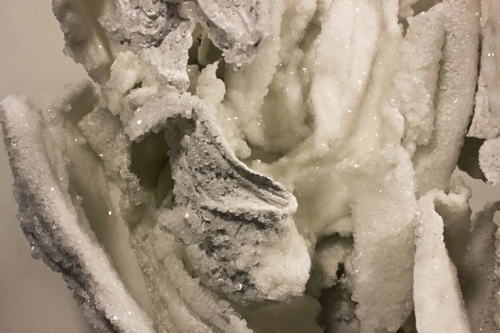 Created by growing sodium tetraborate crystals on textures made of plaster gauze, it explores the cycle of decay, transformation, and rebirth. This work experiences its own cycles of life: over time, the crystals become completely opaque and white as they age, weaken and eventually decompose.