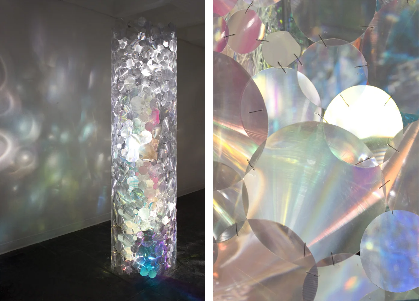 In this work, magnifying lenses obscure an interior sculpture made of glass, epoxy resin and pigments, while casting light onto the surrounding walls. As one moves around the sculpture, the lenses flicker as though coming into and out of existence, playing with the viewer's perception of solidity and space.